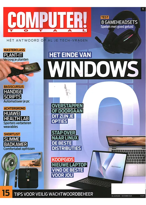 Computer! Totaal – Nr. 11, november 2025 – Test 8 gameheadsets spelen met goed geluid – Masterclass Plant-IT verzorg je planten – Basiscursus handige scripts automatiseer je pc – Achtergrond Huawei Health Lab sporters verbeteren met wearables – Shortlist slimme badkamer comfortabel opfrissen – Het einde van Windows – Overstappen of doorgaan dit zijn je opties – Stap over naar Linux de beste distributies – Koopgids nieuwe laptop vind de beste voor jou – 15 tips voor veilig wachtwoordbeheer.