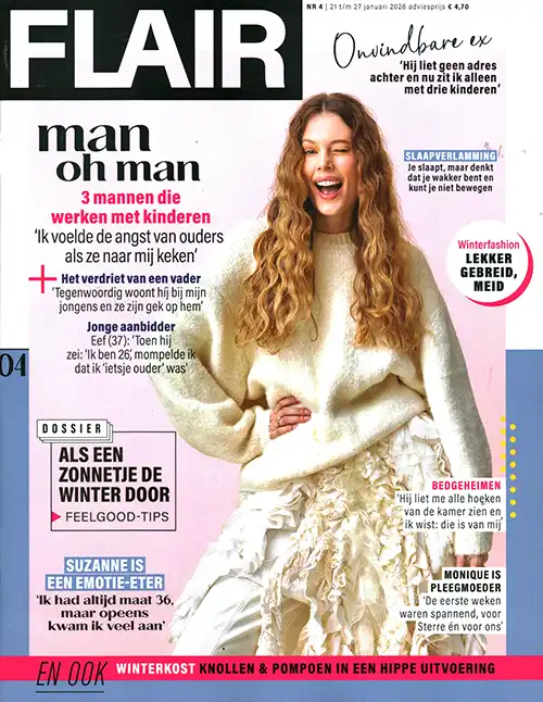 man oh man – 3 mannen die werken met kinderen – ‘Ik voelde de angst van ouders als ze naar mij keken’ – Het verdriet van een vader – ‘Tegenwoordig woont hij bij mijn jongens en ze zijn gek op hem’ – Jonge aanbidder – Eef (37): ‘Toen hij zei: ik ben 26, mompelde ik dat ik ietsje ouder was’ – Onvindbare ex – ‘Hij liet geen adres achter en nu zit ik alleen met drie kinderen’ – Slaapverlamming – Je slaapt, maar denkt dat je wakker bent en kunt je niet bewegen – Winterfashion – Lekker gebreid, meid – Dossier – Als een zonnetje de winter door – Feelgood-tips – Suzanne is een emotie-eter – ‘Ik had altijd maat 36, maar opeens kwam ik veel aan’ – Bedgeheimen – ‘Hij liet me alle hoeken van de kamer zien en ik wist: dit is van mij’ – En ook – Winterkost knollen & pompoen in een hippe uitvoering