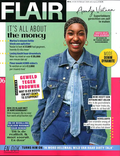 It’s all about the money – Marlou’s nieuwe liefde bleek een oplichter – ‘Nadat ik hem €17.000 had gegeven, hoorde ik niks meer’ – Lesley kocht haar droomhuis – ‘Maar nu moet er voor €55.000 een nieuw dak op’ – Fleur maakt ASMR-video’s – ‘Ik verdien er zo’n €2.000 per maand mee’ – DOSSIER – GEWELD TEGEN VROUWEN – WAT IS ER NODIG OM HET ECHT TE STOPPEN? – Ook zo klaar met je kantoorbaan? – Drie vrouwen die nu voor hun werk altijd buiten zijn – Na de bevalling verloor Roxanne haar benen – ‘Dit is de realiteit. Ik moet vooruit. En door.’ – Avondje Vietnam – Superlekkere gerechten om zelf te maken – GRATIS GELD VOOR WERELD – De verborgen tekens van het basisinkomen – MODE – DENIM DYNAMITE – Mimi heeft een affaire met Jolin – ‘Als ik de gezichtsuitdrukking op haar Insta zie, denk ik: zó fout dit’ – Verslaafd – ‘Een vriendin vroeg of ik zelf nog keuzes maakte of AI alles liet doen’ – EN OOK – Turns him on – ‘Ik word helemaal wild van haar dirty talk’