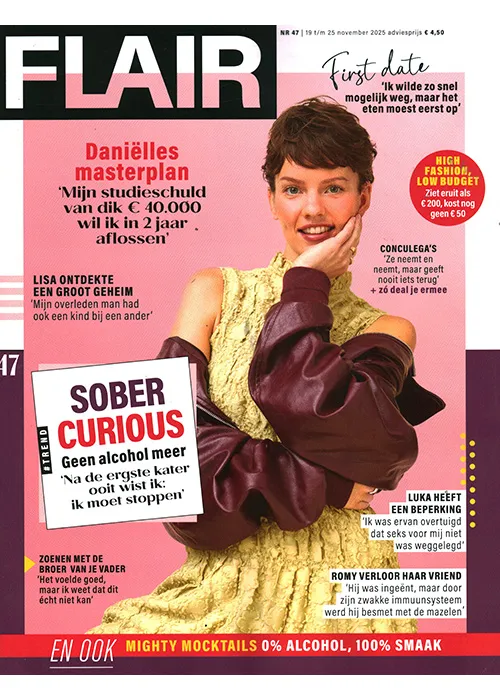 First date: “Ik wilde zo snel mogelijk weg, maar het eten moest eerst op!” – Daniëlle’s masterplan: “Mijn studieschuld van dik €40.000 wil ik in 2 jaar aflossen” – High fashion, low budget: 7 zetels vanaf €200, loopt tot geen €500 – Lisa ontdekte een groot geheim: “Mijn overleden oma had ook een kind bij een ander” – Conculega’s: “Ze neemt mijn recepten, maar geeft nooit meer iets terug: zo deal je ermee” – Sober curious: geen alcohol meer – “Na de ergste kater ooit wist ik: ik moet stoppen” – Zoenen met de broer van je date: “Ik had nooit gedacht dat dit écht kon schakelen” – Luka heeft een beperking: “Ik was ervan overtuigd dat mijn zwangerschapswens was weggelegd” – Romy verloor haar vriend: “Hij was 19, zat nog midden in z’n tweede immunsemester: hij werd besmet met de mazelen” – En ook: mighty mocktails 0% alcohol, 100% smaak.