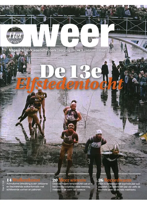 De 13e Elfstedentocht – 14. Wolkenkunst: Actinoforme bewolking is een zeldzame en fascinerende wolkenformatie met schitterende vormen en patronen – 20. Meer sneeuw: Door de hogere temperaturen valt er in het Noordpoolgebied meer neerslag, meestal in de vorm van sneeuw – 26. Recordwarm: 2024 is wereldwijd het warmste jaar ooit gemeten. De laatste tien jaar zijn zelfs de warmste jaren uit de hele meetreeks