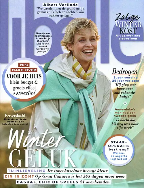 Albert Verlinde – ‘We werden met de grond gelijk gemaakt, ik heb er nachten van wakker gelegen’ – Noortje was naaktdans in een Parijs showballet – ‘Drie keer in de week werden we gewogen’ – Mini make-over – Voor je huis – klein budget groot effect + winactie! – Zalige winterkost – Uit de oven met blauwe kaas – Bedrogen – Susan werd na 25 jaar verlaten – ‘Hij ging met haar naar ons vakantiehuisje’ – Annemieke’s man had een tweede gezin – ‘Ik dacht dat hij weg was voor zijn werk’ – Eetverslaafd… – Hanneke ontdekte waarom ze de hele dag door snackt – Winter geluk – Tuinleveling – De toverhazelaar brengt kleur – Sta op & start – Welness, de oostarts legt het uit – Zin in zon? – Op Gran Canaria is het 365 dagen mooi weer – Casual chic of speels – 21 overhemden