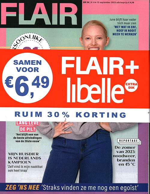 Flair 36 2023: 21 pagina’s persoonlijke verhalen – Saskia’s broer werd zomaar doodgestoken: ‘De dader bleek een patiënt met een paar uur verlof’ – Lang leve de pil? ‘Het blijft een van de beste uitvindingen van de 20ste eeuw’ – Mijn huisdier is Nederlands kampioen: ‘Zelf vind ik mijn naaktkat ook heel knap’ – June blijft haar vader tóch maar zien: ‘Met wat ik erf, hoef ik nooit meer te werken’ – Reportage. De zomer van 2023: noodweer, branden en 45 graden – Zeg ‘ns nee: ‘Straks vinden ze me nog een egoïst’