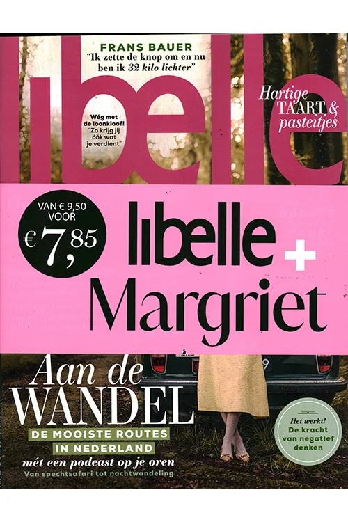 Libelle 47 2023: Aan de wandel: De mooiste routes in Nederland mét een podcast op je oren: Van spechtsafari tot nachtwandeling – Openhartige verhalen – Waar doet ze het van? ‘Die twee ton spaargeld is ons pensioen’ – Liefde op latere leeftijd: ‘Het vinden van een man is een heuse baan’ – Een hospice voor jongeren: ‘Niet alle jonge zieke mensen willen terug naar hun ouders’ – Voor elk budget de perfecte bank + tips, trends & kleuren – Hartige taart & pasteitjes – Wég met de loonkloof! ‘Zo krijg jij óók wat je verdient’ – Frans Bauer: ‘Ik zette de knop om en nu ben ik 32 kilo lichter’