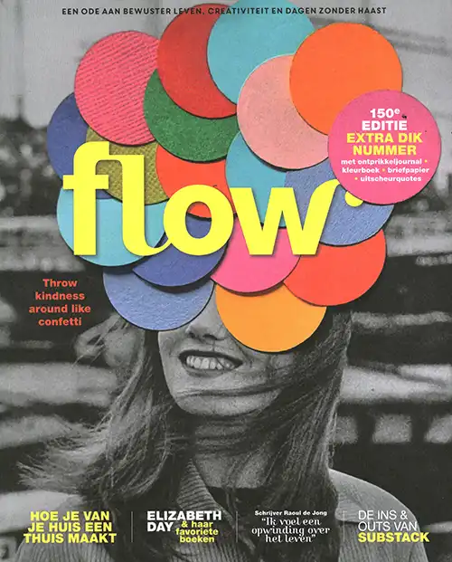 Flow is het tijdschrift voor iedereen die graag wat meer tijd voor zichzelf wil en op zoek is naar authenticiteit en rust. Het magazine Flow is voor een ieder die het leven net anders wil aanpakken en nuchtere en praktische oplossingen zoekt. Flow geeft inzichten & inspiratie over hoe dingen gedaan kunnen worden en om bepaalde keuzes te maken. Flow is een tijdschrift zonder haast, over geluk, mental health, een simpeler leven en creativiteit.