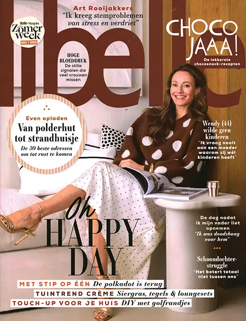 Art Rooijakkers: “Ik kreeg stemproblemen van stress en verdriet” – Choco jaaa! De leukste chocosnack-recepten – Even opladen: Van polderhut tot strandhuisje De 30 beste adressen om tot rust te komen – Oh Happy Day – Wendy (44) wilde geen kinderen: “Ik vraag nooit aan een moeder waarom zij wel kinderen heeft” – De dag nadat ik mijn vader liet opnemen “Ik was doodsbang voor hem”