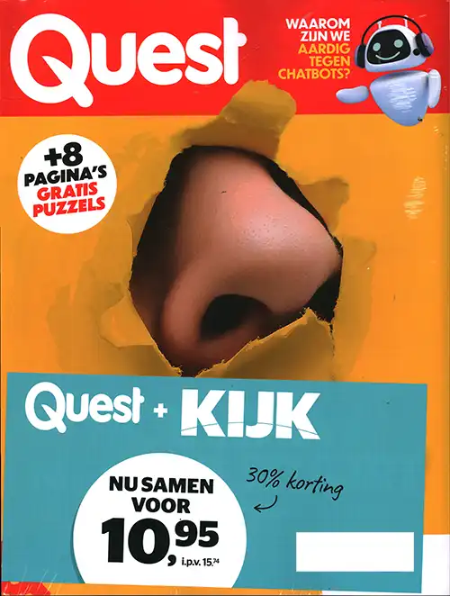 Quest: In Quest vind je elke maand een spannende mix van kennis en plezier. We noemen het braintainment. Je krijgt antwoord op fascinerende, verrassende vragen over psychologie, gezondheid, voeding, natuur, wetenschap, techniek, sport en reizen. Kijk: Bij KIJK zijn we ervan overtuigd dat we de wereld nóg beter moeten leren begrijpen. Daarom onderzoeken we populairwetenschappelijke en technische onderwerpen vanuit verschillende invalshoeken. In KIJK lees je elke maand aantrekkelijke en begrijpelijke artikelen over actuele thema’s.