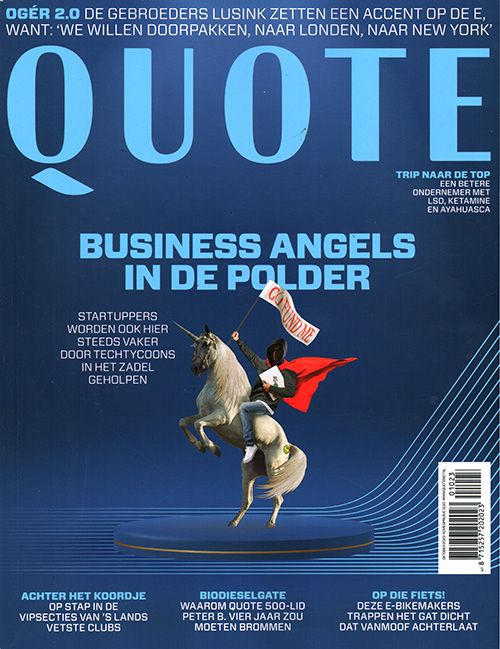 Business angels in de polder. Steeds meer startuppers worden ook hier steeds vaker door techtycoons in het zadel geholpen – Ogér 2.0. De gebroerders Lusink zetten een accent op de E, want: ‘We willen doorpakken, naar Londen, naar New York’ – Achter het koordje: op stap in de vipsecties van ’s Lands vetste clubs – Biodieselgate. Waarom Quote 500-lid Peter B. vier jaar zou moeten brommen – Op die fiets! Deze e-bikemakers trappen het gat dicht dat Vanmoof achterlaat