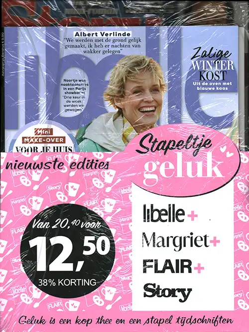 Geluk is een kop thee en een stapel tijdschriften. In dit tijdschriften pakket Stapeltje Geluk krijg je de nieuwste edities van de Libelle, Margriet, Flair & Story. Deze 4 nu allemaal in 1 pakket met een flink voordeel.