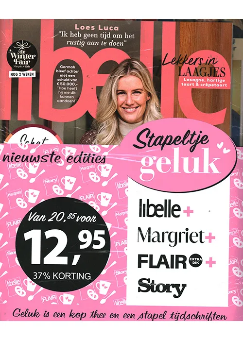 Geluk is een kop thee en een stapel tijdschriften. In dit tijdschriften pakket Stapeltje Geluk krijg je de nieuwste edities van de Libelle, Margriet, Flair & Story. Deze 4 nu allemaal in 1 pakket met een flink voordeel.